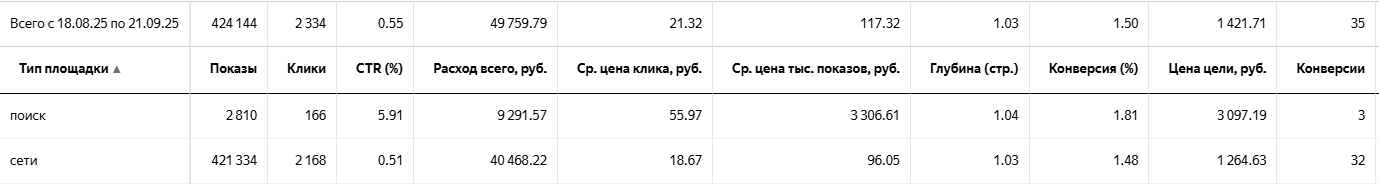 За месяц работы мы потратили около 50 000 рублей, получили 35 заявок по 1 422 рубля